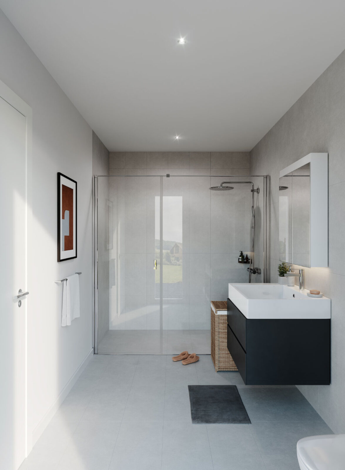 Im Winter: wohlige Wärme aus der Erdsonden-Wärmepumpe für die Bodenheizung. Im Sommer: angenehme Temperaturen dank Free-Cooling. Entdecken Sie weitere Details der hochwertigen Ausstattung.